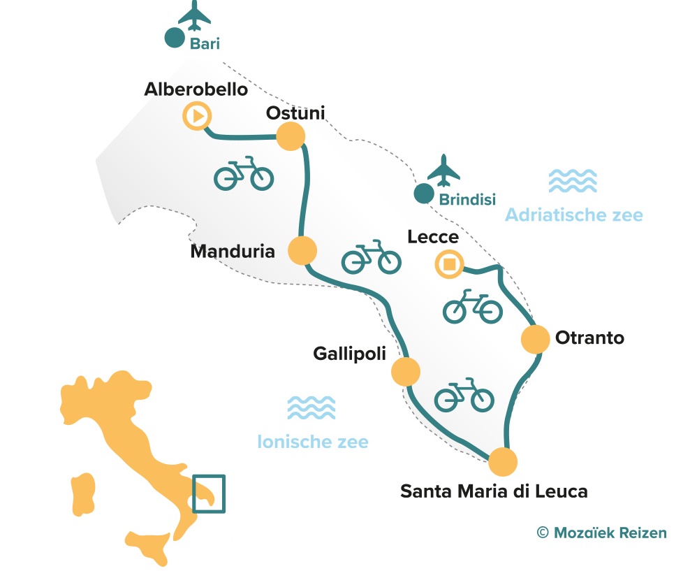 De ongerepte kustlijn van Puglia wordt gekenmerkt door het diepblauwe water, kliffen, pittoreske dorpjes en zandstranden. Maar de regio heeft meer te bieden, met culturele en historische schatten zoals de trulli van Alberobello (UNESCO), het sprookjesachtige Ostuni en het idyllische platteland. Fiets langs de kust van Salento, met indrukwekkende grotten, historische stadjes en verborgen baaien. De keuken van Puglia is ook een feest. Verse, lokale ingrediënten: van de beste olijfolie en wijnen tot de heerlijkste zeevruchten en pasta’s.